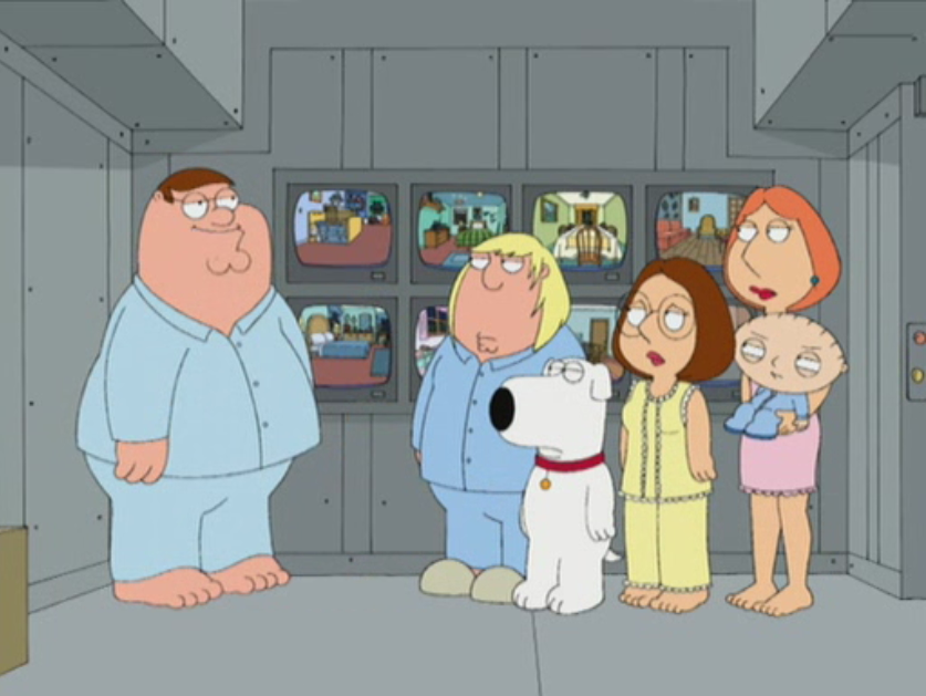 | Ein Einbrecher reißt die Griffins aus dem Schlaf, und sie suchen Zuflucht auf dem Dachboden, wo Peter einen Panikraum eingerichtet hat, in dem sich die Familie in Sicherheit verbarrikadieren kann. Leider haben sie kein Telefon, um Kontakt mit der Außenwelt aufzunehmen. Also schicken sie Meg durch den Lüftungsschacht, um Hilfe zu holen. Derweil löst Peter die Sprinkleranlage aus und langweilt die anderen Ertrinkenden mit Familiengeschichten aus grauer Vorzeit ... | ||||||||||||||||||||||||||||||||||||||||||||||||||||||||||||||||