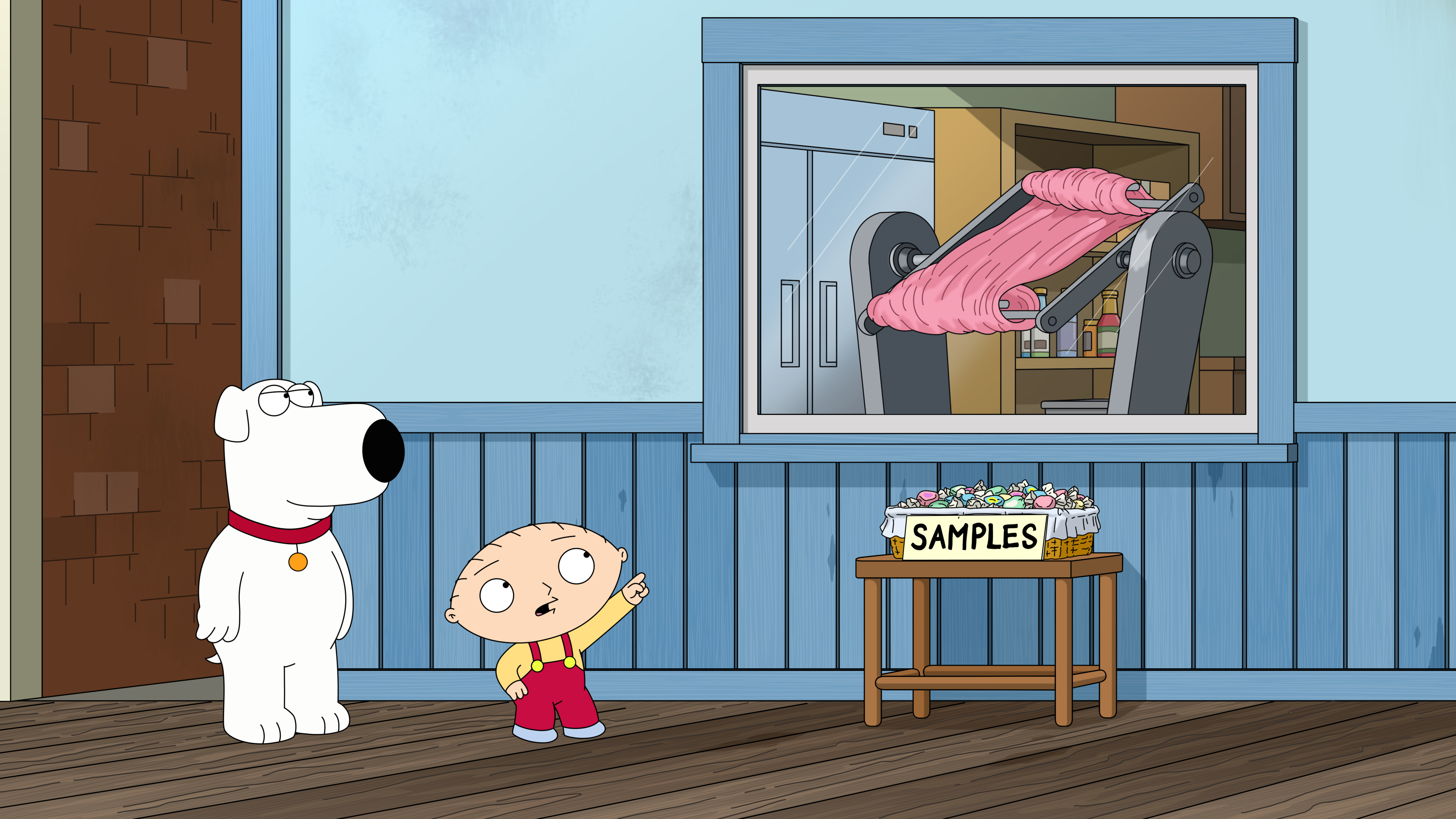 Meanwhile, Stewie and Brian discover the wonders of saltwater taffy during their trip, and upon realizing how cheap it must be due to it being the off-season, they decide to purchase it in bulk and sell it back home for a profit. Following a strenuous rehearsal process, the two start selling their wares throughout the neighborhood, but aside from Bruce, nobody seems to be interested in the product. Stewie and Brian decide to rebrand their taffy as something else to win the public over, ultimately deciding on "ChewAnon," which they successfully sell to Donald Trump's supporters at his various rallies.