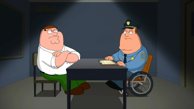 After they collect, Quagmire continues to worry and Joe seems to hang around more than they expect. When Joe starts to discover they things aren't adding up at the fire, the guys try to distract him. As Quagmire is about to crack, Joe arrives after finding a voice mail of Peter talking about the crime after accidentally dialing Joe with his phone in his pocket and places the group under arrest. Mort threatens to run but refuses after seeing his old gym teacher ready to laugh at him.