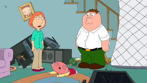 When he gets fed up with the family after their horseplay destroys the television while trying to watch his favorite show, Stewie reveals that he has built a new time machine and uses it to stop his conception. Going back three years into the past, he observes the events prior to his conception. Getting back to business, he discovers that Peter and Lois were truly in love, but sets out to ruin things. Maxing out Lois' credit cards to buy vibrators fails to work, so he shaves Peter's hair to get them to argue, but Lois flatters Peter and it fails to break them up. But he has success when he gives Peter's porn to Goodwill and writes on the walls, setting them off at each other and erasing his original existence.