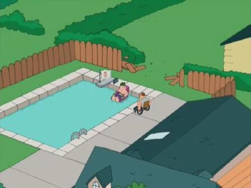 Peter learns that his neighbors have gotten a tax refund and spent it with gifts for themselves, Cleveland gets a trampoline, Quagmire gets a plug-in sex doll, and Joe a digital T.V. with surround sound. Peter on the other hand wants to purchase a swimming pool, but gets audited by the U.S. Internal Revenue Service and is denied a tax refund. His plans to build a backyard pool on his own are further derailed when he accidentally cuts a power line during construction and a man from the power company reveals that the towns' zoning laws prohibit building a pool. When a request for a zoning permit leads to Mayor Adam West, he reveals that Peter’s house is not even part of the United States.