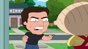 Meanwhile, Lois takes Stewie to the doctor who informs them that Stewie will be very short as an adult. Brian takes Stewie to the mall to buy new clothes and he bumps into Tom Cruise while they both reach for the same shirt. Amazed that they are both the same size, he get invited to hang out with him for the day. They hit it off and Stewie tells Brian about spending the day with Tom. However, Lois gets a call from Dr. Hartman that he misread the chart and Stewie will be normal height. When Tom arrives, Stewie cuts off their relationship, angering Tom. At daycare, Tom suddenly appears during play time and frightens Stewie who runs home to Brian. He explains what is going on to a doubtful Brian. Setting up a trap in the park, they manage to trap Tom and send him off to Zappos, a clothing retailer, where the clerk greets him on his return.