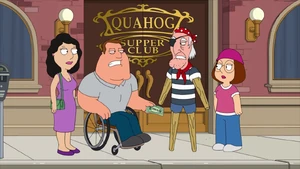 The Quahog Supper Club is where several characters gather near the end of "Follow the Money" as they finish their day, with Joe taking Bonnie out to dinner while Seamus and Meg have a date and Brian admits to Stewie that he can't go a day without alcohol. Ida Davis performs as the lounge singer with Ryan Reynolds playing the piano for her.